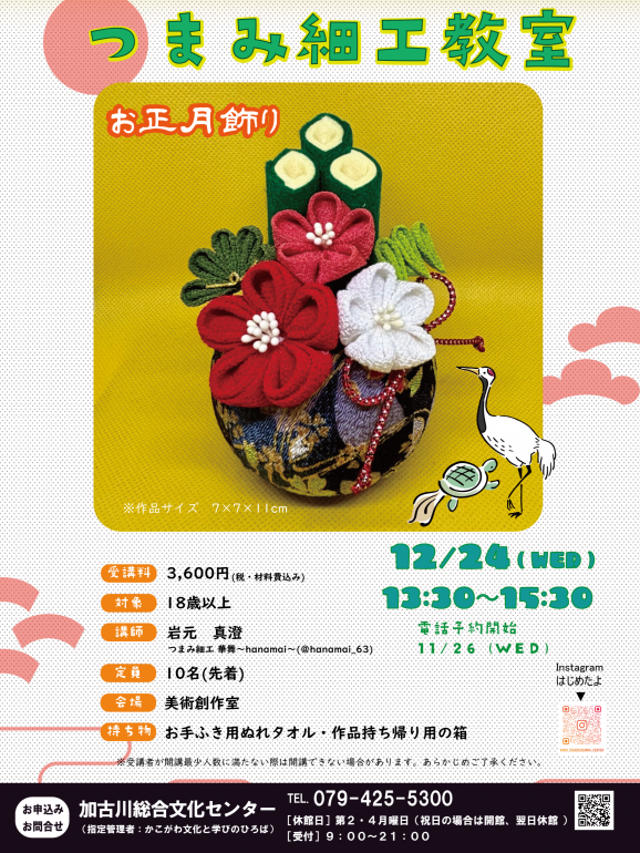 2025年11月16日「つまみ細工教室」12月24日 12月24日(水)13:30~15:30 内容:つまみ細工で作る『お正月飾り』 料金:3,600円 定員:10名 対象:18歳以上 講師:岩元 真澄(つまみ細工 華舞~hanamai~) 申込開始:11月26日(水)9時から電話受付
