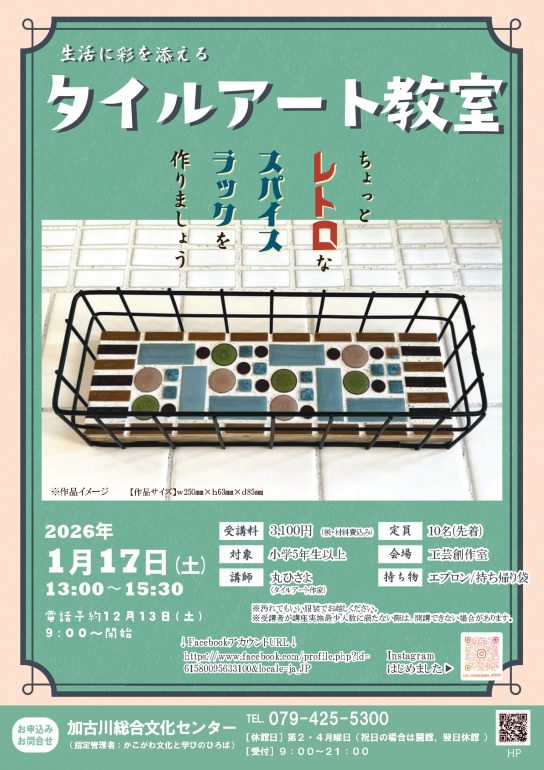 2026年1月4日タイルアート 1月17日 1月17日(土)13:00~15:30 内容:ちょっとレトロなスパイスラックを作りましょう 料金:3,100円 対象:小学5年生以上 12月13日(土)9時より電話予約開始 ※予約受付最終日は1月12日(月)
