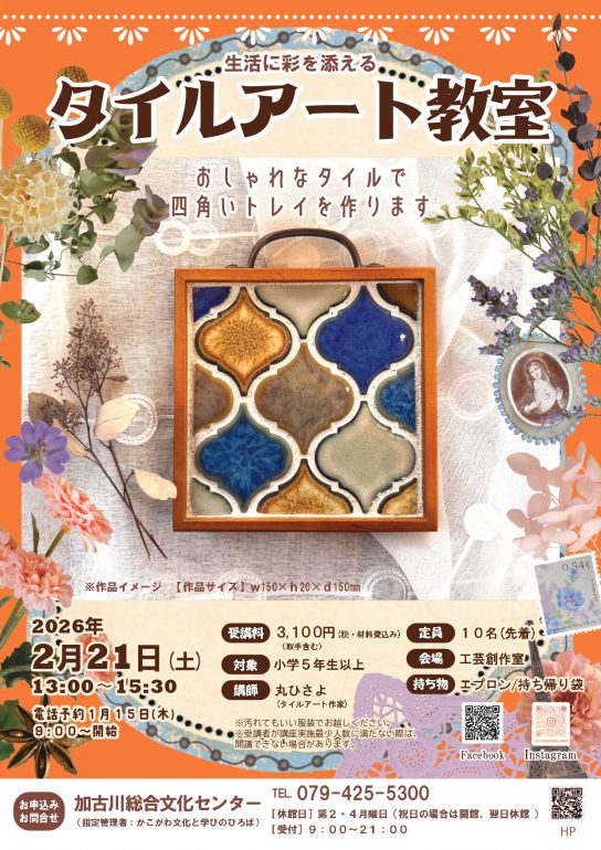 2026年1月17日タイルアート 2月21日 2月21日(土)13:00~15:30 内容:おしゃれなタイルで四角いトレイを作ります 料金:3,100円(税込)※取っ手含む 対象:小学5年生以上 1月15日(木)9時より電話予約開始 ※予約受付最終日は2月17日(火)